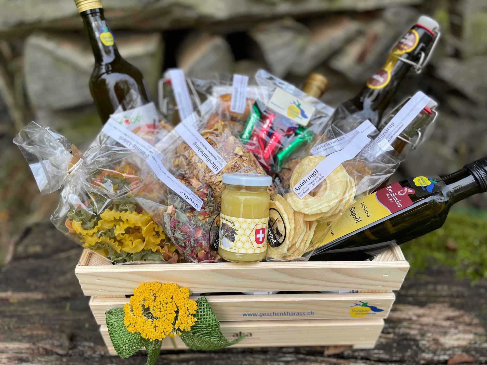 Besonders wertvoll: der ansprechende Holzharass wird mit Hingabe von Menschen mit Beeinträchtigung bei ABA in Amriswil handgefertigt. Sie unterstützen mit jedem Geschenkharass nicht nur regionale Qualität und engagierte lokale Produzenten, sondern auch soziale Projekte – ein Geschenk mit Herz und Verantwortung.